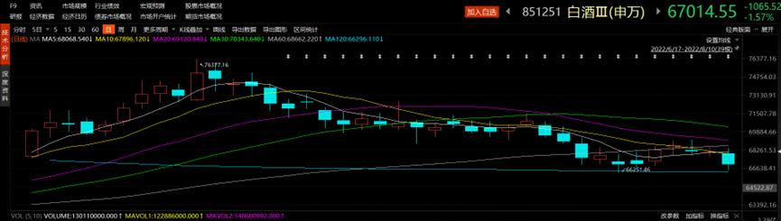 7月1日至8月10日,申万三级行业白酒指数由75187点下跌至67014点,跌幅10.87%。