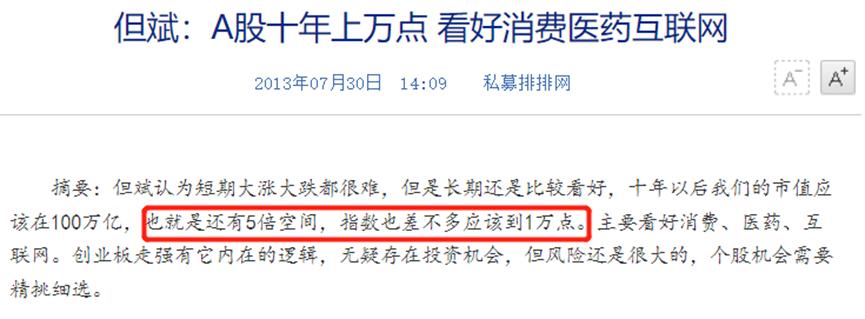 更早前的2013年,但斌还曾预言,上证指数十年后将达到万点左右。