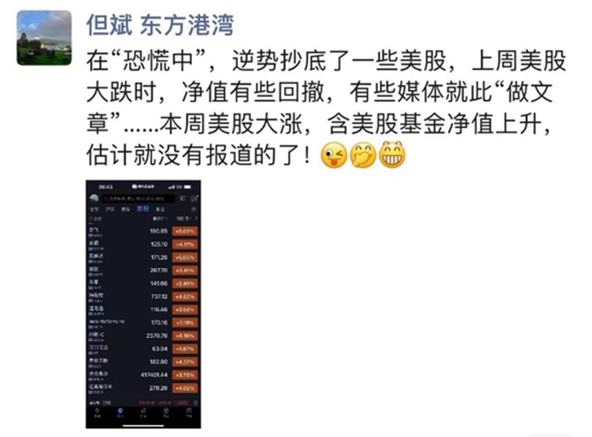 “在‘恐慌中’,逆势抄底了一些美股,上周美股大跌时,净值有些回撤,有些媒体就此‘做文章’……本周美股大涨,含美股基金净值上升,估计就没有报道的了!”