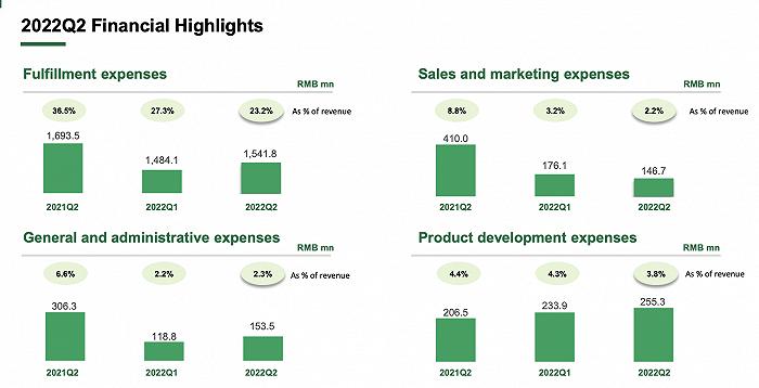 其中,履约费用为15.42亿元,较一季度的14.84亿元环比略微增长,同比下降9.0%,占总营收的比例下降至23.2%。财报称,履约费用占比的下降主要是由于平均客单价和一线人效的提升。