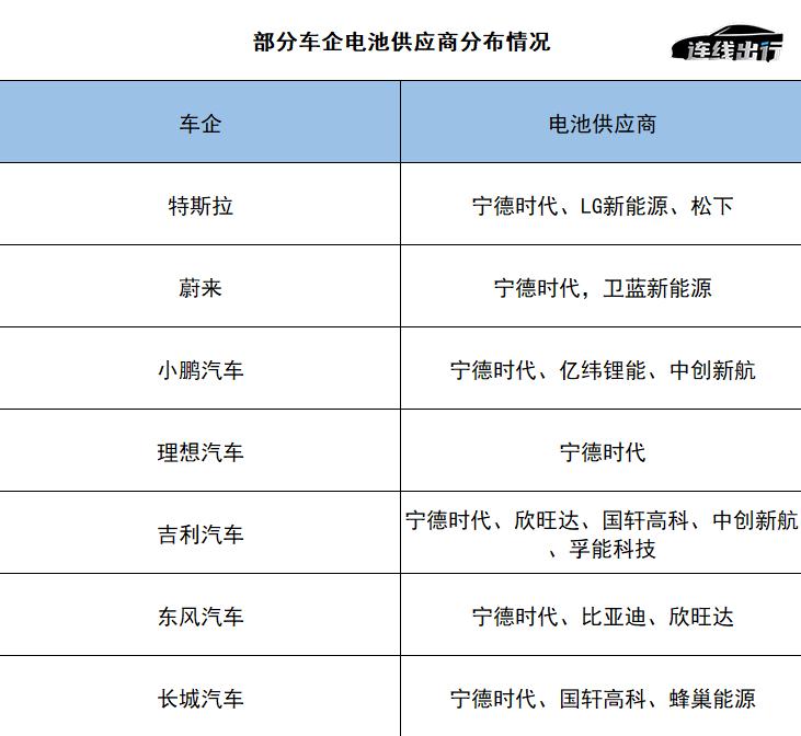 造车新势力们是这样,其他传统车企亦是如此。比如吉利汽车,选用的电池供应商就有宁德时代、欣旺达、国轩高科、中创新航和孚能科技;东风汽车和长城汽车也除了宁德时代之外,也各选择了比亚迪、欣旺达和国轩高科等电池供应商。