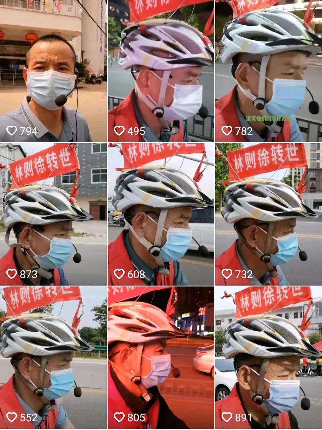 郑立书出身湖北麻城,今年52岁,曾经对网络一窍不通的他,如今在短视频平台上有一副固定的形象。身穿红色马甲,头戴一副自行车头盔,马甲上写的是“关停网络游戏,救救网瘾家人”,头盔上插着一面写着“林则徐转世”的小旗子,身边的自行车同样插着一面印有反网游口号的的横幅。