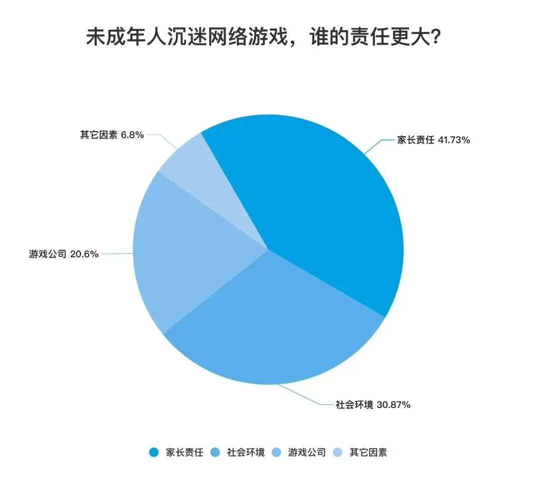 去年经济参考报的报道出来之后,新浪科技进行了一个“未成年人沉迷网络游戏,谁的责任更大一些”的网络调查。截至8月3日晚上9点,共有8627人参与,其中,认为游戏公司责任更大的有1777人,占比为20.6%;认为家长责任更大的有3600人,占比为41.73%;认为是社会环境造成的有2663人,占比为30.87%;剩余的6.8%则认为是其他因素造成的。
