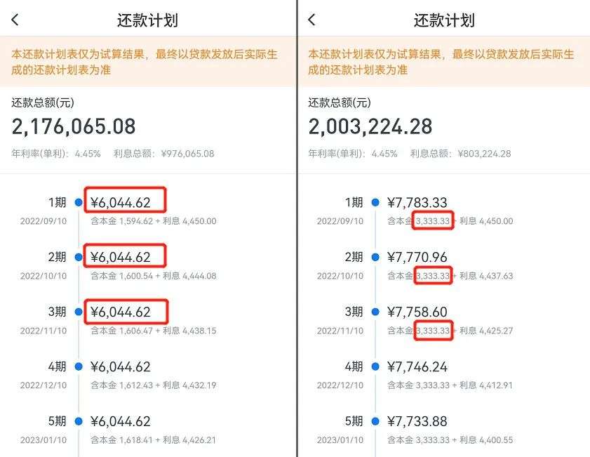 (左图:等额本息模式,右图:等额本金模式。来源:交通银行贷款计算器)