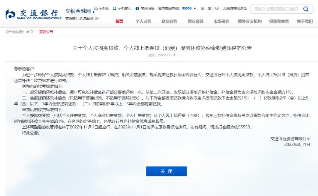 8月1日,作为国有大行之一的交通银行,发布了关于个人按揭类贷款、个人线上抵押贷(消费)提前还款补偿金收费调整的公告,宣布2022年11月1日后,提前还款收取补偿金,具体以贷款合同中约定为准,收取比例为提前还款本金金额的1%。