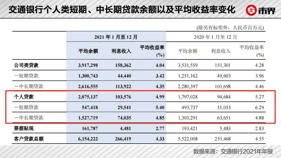 交通银行年报数据显示,2021年的客户贷款总额约为6.15万亿元,其中个人类短期贷款平均余额为5474.18亿,同比增长10.87%;个人类中长期贷款平均余额从2020年的1.3万亿增长至1.53万亿,较上年同期增长17.22%。