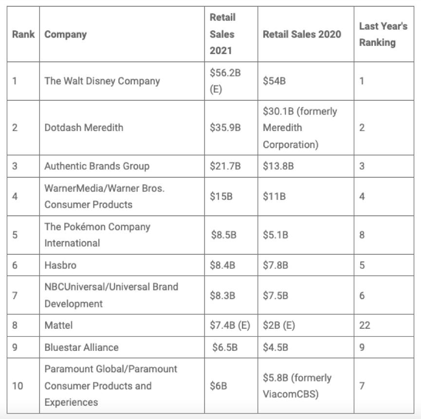 2022年全球TOP 10授权商排名 资料来源:License!Global《2022年全球授权商报告》