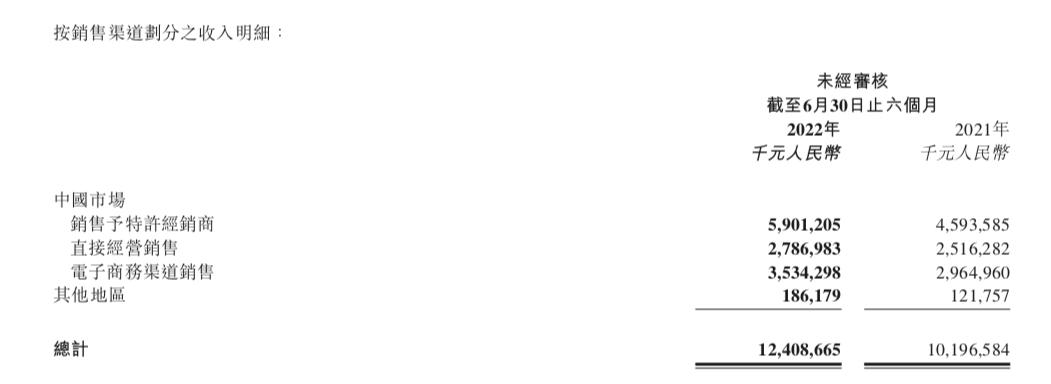 2022年上半年,经销商、直营与电商营收分别占总收入的47.5%、22.5%和28.5%,经销商和直营占比达70%。