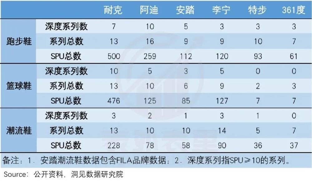 而在“表外表里”总结的各品牌系列SPU数,则能更直观地看到差距。在跑步鞋、篮球鞋、潮流鞋三个品类中,耐克遥遥领先,阿迪达斯的跑步鞋系列,也比国内品牌多出一倍。