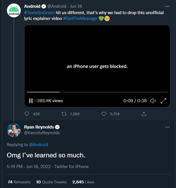 最近几个月谷歌跟苹果叫板的程度已经越来越激烈了。前段时间嘻哈歌手 Drake 发了一首歌提到气泡颜色歧视梗,谷歌还站出来解释个中原因,就连《死侍》演员 Ryan Reynolds(还有一个身份是运营商 Mint Mobile 老板)也出来凑热闹了: