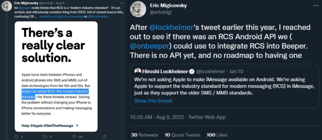 “这违背了设计整个系统的初衷。只有谷歌和三星的原生短信应用支持 RCS。如果我们的产品想要支持他的话,必须建立一个完整的 RCS 系统,可能要拥有像运营商那样的后端。如果我的理解正确,现在想要开发一个支持 RCS 的第三方聊天应用是不可能的。”