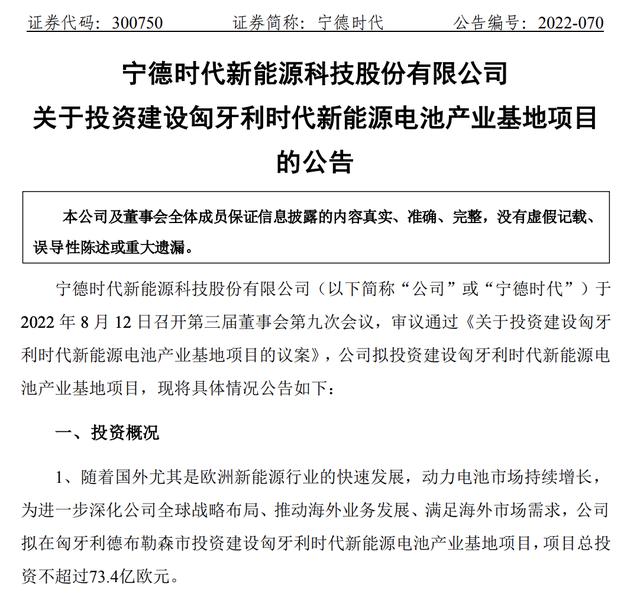 8月12日,宁德时代发布公告称,拟在匈牙利投资73.4亿欧元(约合人民币512亿元)建设100GWh动力电池系统生产线,总建设期预计不超过64个月,首栋厂房年内动工。
