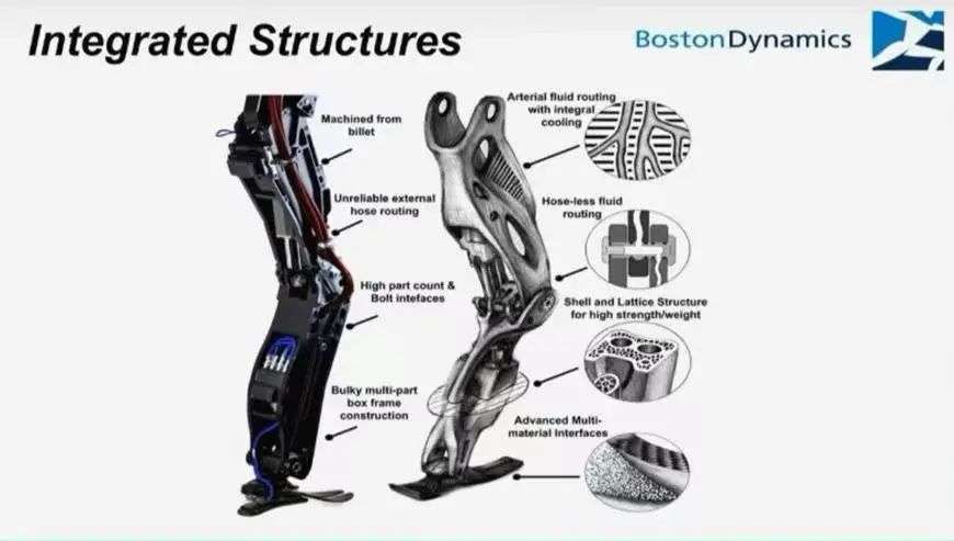 但通过3D打印的方式,波士顿动力将包括输油管在内所有动力装置零部件都嵌入到了腿部的机械结构中,就像人的血管一般。相关专家解读称,“这个技术非常厉害,就像人的血管一样,它不再需要外挂的油管,而是能够融到机器人体内,同时将整个结构做的非常紧凑。”
