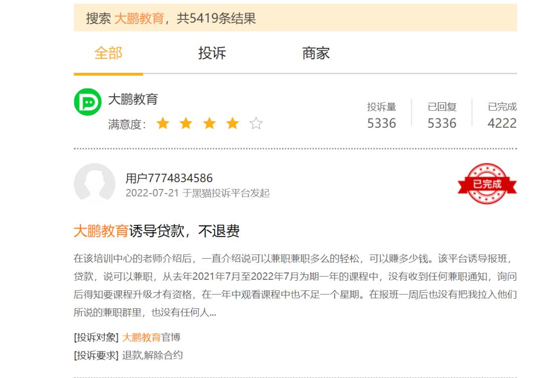 而事实上,锌刻度发现,大鹏教育在“黑猫投诉”上已有5268条,投诉内容多为诱导消费、诱导贷款、退费难、虚假宣传等内容,其下也不乏有诱导贷款的集体投诉内容。