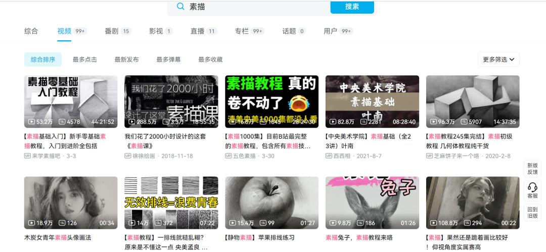 可见,“共享资源”在大学生群体极受欢迎,锌刻度发现,在B站上搜索“素描”,不仅有教程还有相关直播,入门、进阶等都有相关课程。