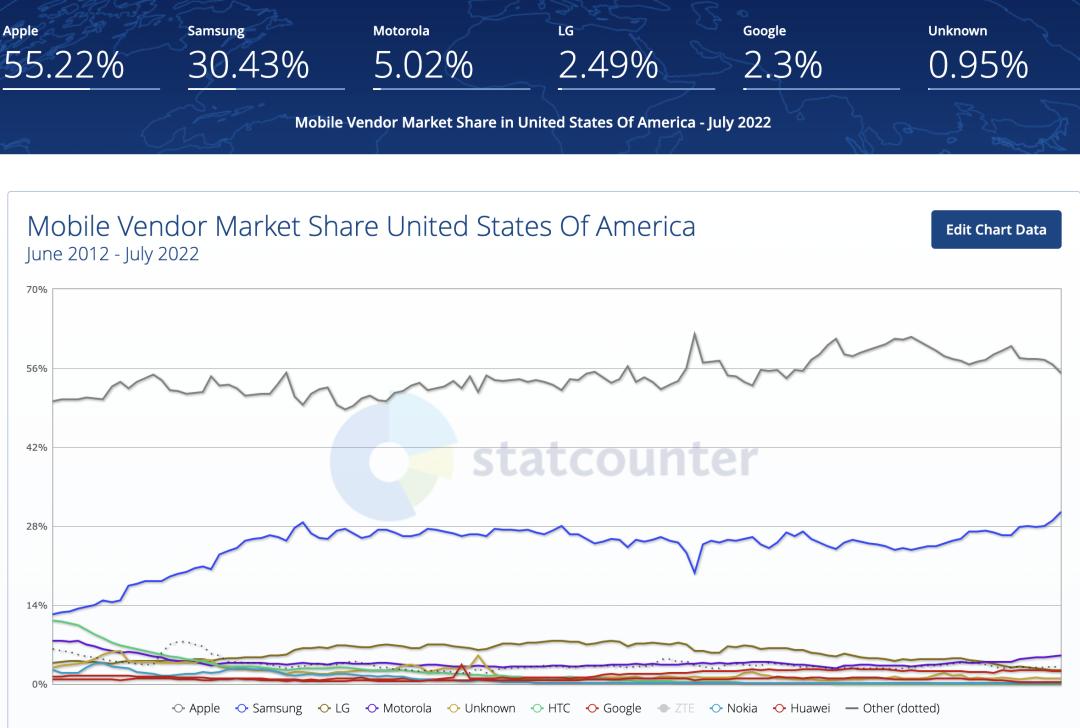 两大超巨主宰美国市场的“二人转局面”已经延续了十年时间。Statcounter的数据显示,苹果iPhone美国市场份额在2012年首次突破50%大关,此后从未跌破50%的门槛。而三星的市场份额也从2014年开始始终保持在25%以上,一度达到34%的高点。
