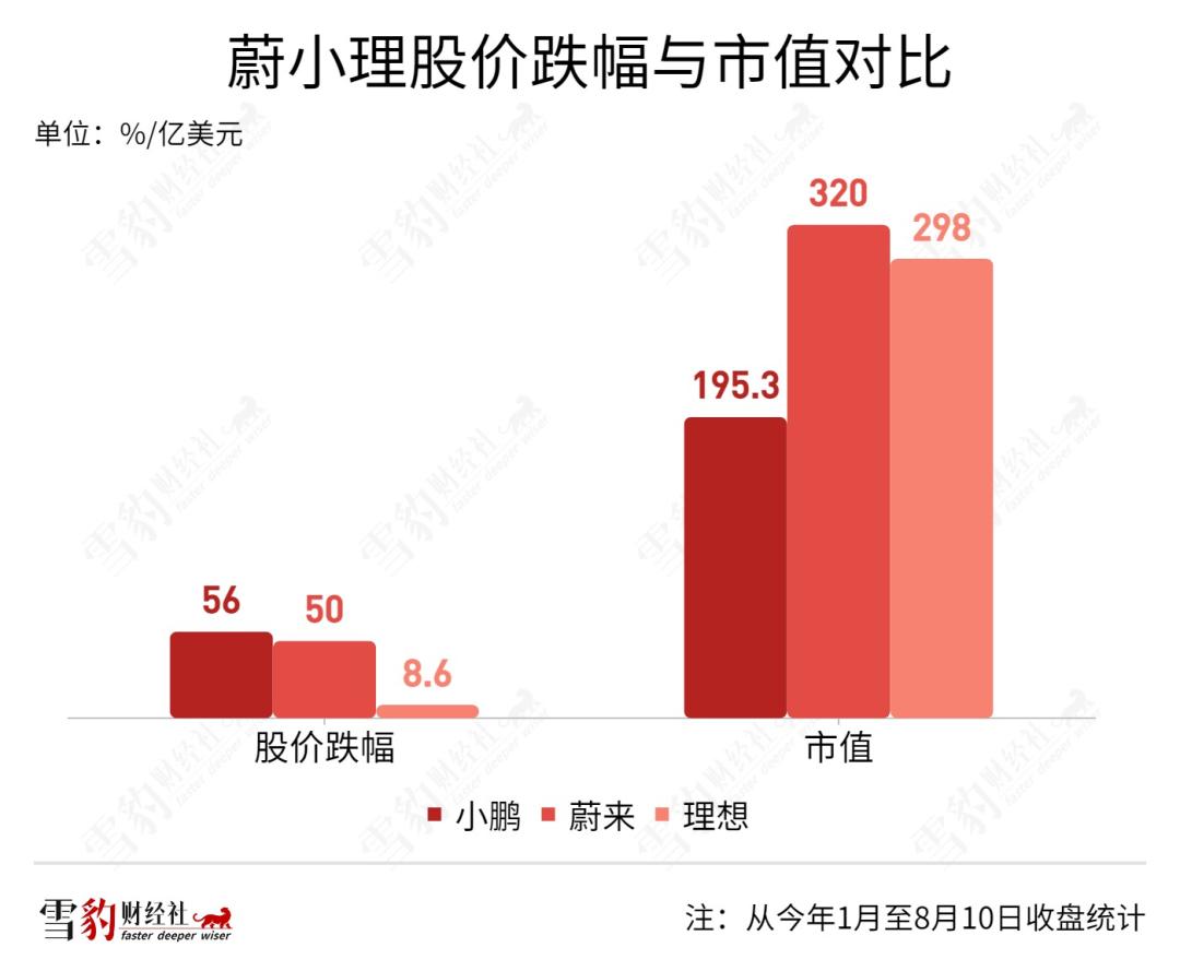 今年以来,小鹏股价从1月的51.5美元高点跌至目前的22美元上下,跌幅超过56%,市值仅相当于蔚来和理想的六成左右。