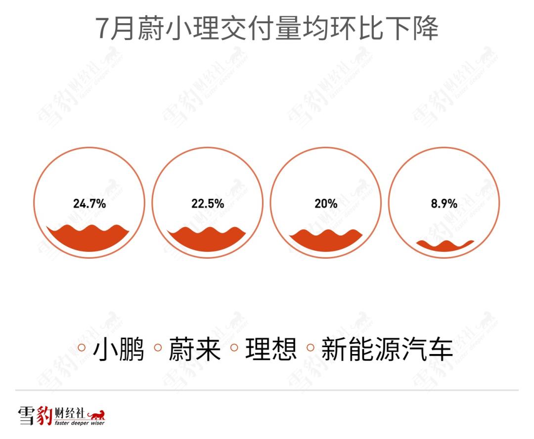 从销量上看,小鹏在7月用一半的时间以价换量,但效果寥寥。7月,小鹏交付11524辆,虽然在“蔚小理”中仍然领先,但被二线新势力车企零跑、哪吒超越,屈居第三。与6月相比,小鹏交付量环比下降24.7%,远超新能源汽车整体销量降幅(8.9%)。