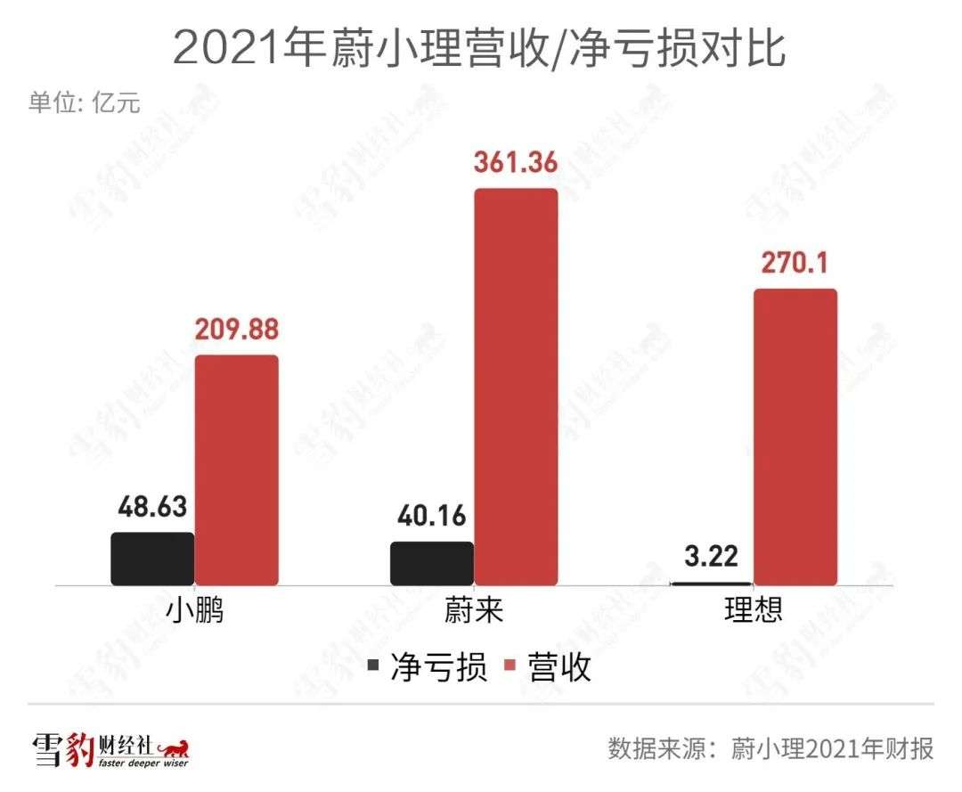 因此,小鹏在造车新势力中卖得最多,也亏得最多。2021年,小鹏净亏损48.63亿元,亏损额超过蔚来和理想之和。从营收层面对比,小鹏则是三家中最低的。