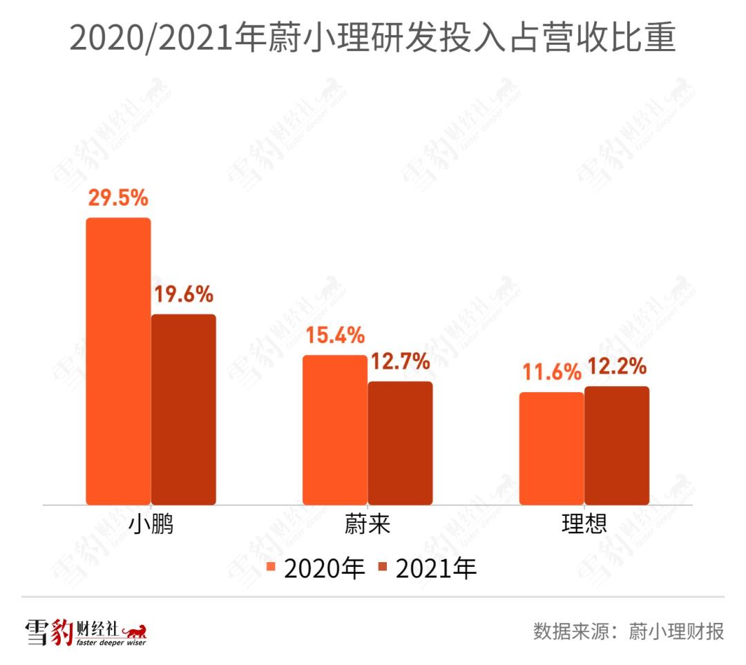 此前,小鹏的高亏损很大程度上来源于在研发上的高投入。2021年,小鹏的研发投入占营收的比重为19.6%,高于蔚来的12.7%和理想的12.2%。