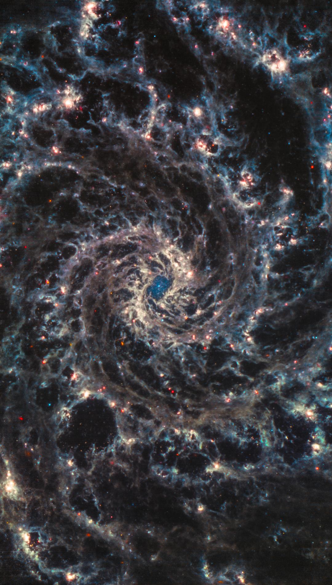 这是韦布望远镜使用中红外设备拍摄的M74中心局部,不同波长的影像被人为赋予了红、青、橙等不同的颜色,揭示了这个星系中呈螺旋状分布的尘埃。