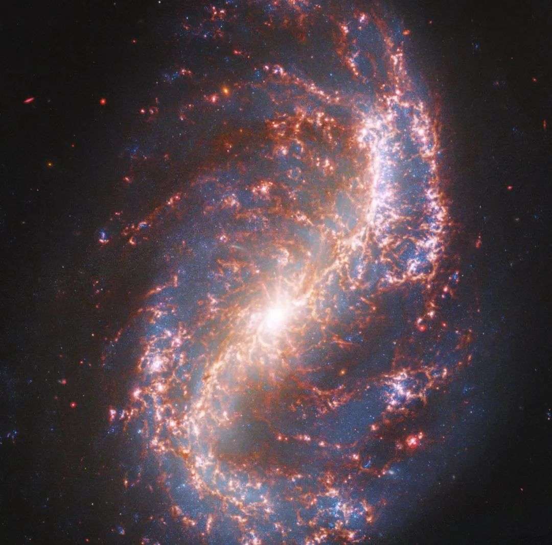 这种颜色标明了星系中富含碳氢化合物的尘埃,由韦布望远镜的中红外设备拍摄。