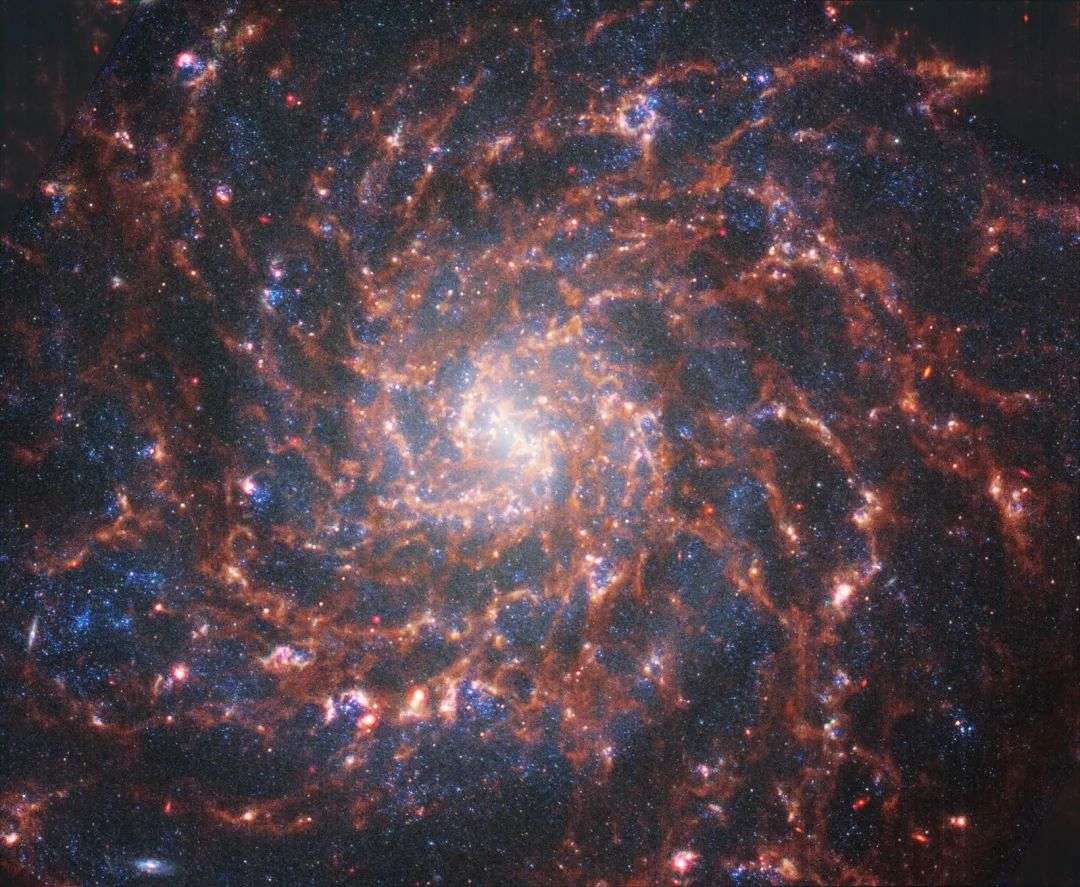 韦布在中红外波段拍摄的影像(上图中的红色),同样揭示出了这个星系中尘埃的螺旋状分布。
