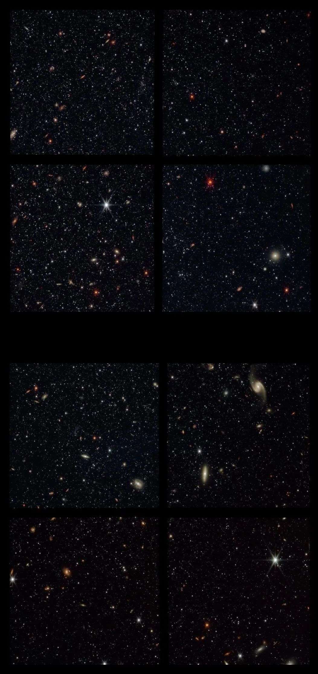 这是北斗七星斗柄附近的天区,由韦布望远镜的近红外相机拍摄的690张单帧图像叠加拼接而成,覆盖的天区面积是韦布公布的首张深场照片的8倍。