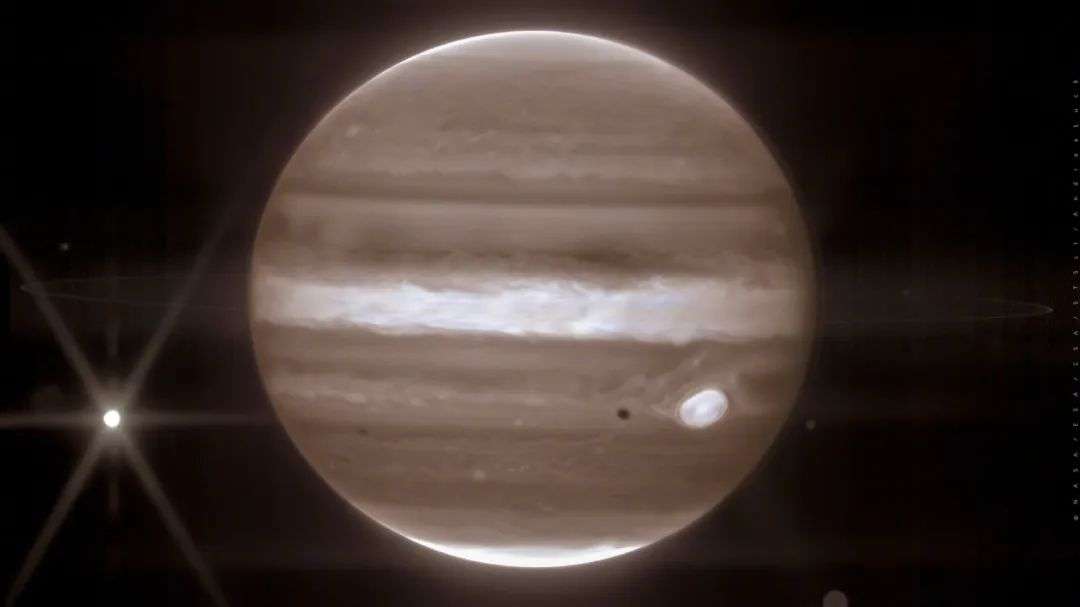图中可以清楚地看见木星表面复杂的云带,以及著名的木星大红斑。注意,大红斑变成了大白斑,是因为韦布拍摄的是木星的红外影像,跟我们肉眼看到的可见光影像不太一样。