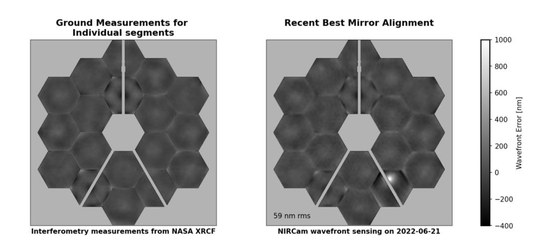 韦布望远镜主镜片的对齐情况,左为几年前在地面实验室测得的理想状态,右为6月21日在太空实测的状况,右下那块主镜片上可见明显凹痕 | NASA/STScI