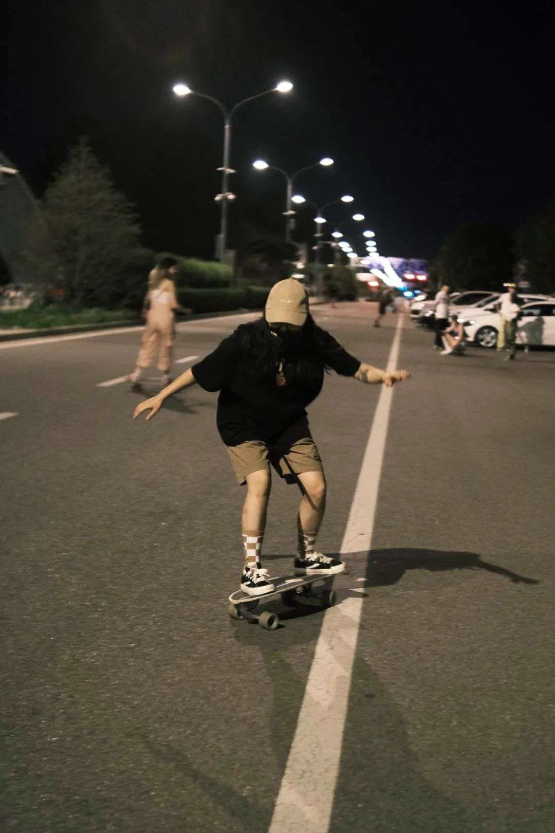有脚踩板鞋的双翘男孩,也有穿着时尚的长板女孩;在广场和景观大道中央,是一批玩陆冲的潮男潮女;还有正在练习基本动作的孩童,小小的身体不熟练地扭动向前;更有六七十岁依然动作灵活的大爷,帅气上板的瞬间秒变追风少年,成为一道亮丽的城市风景线。