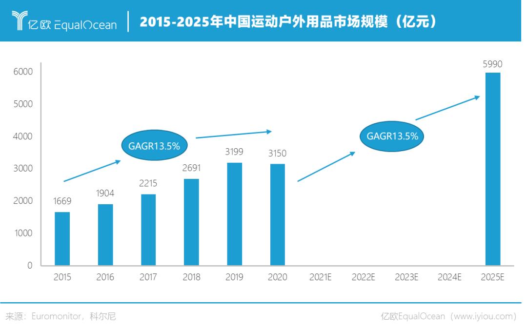 伴随人们户外运动需求的日益增长,相关市场也迎来新的发展窗口。科尔尼管理咨询公司和天猫联合发布的《运动户外私域趋势洞察》显示,2020年我国户外用品市场规模达3150亿元,2025年预计达到5990亿元。