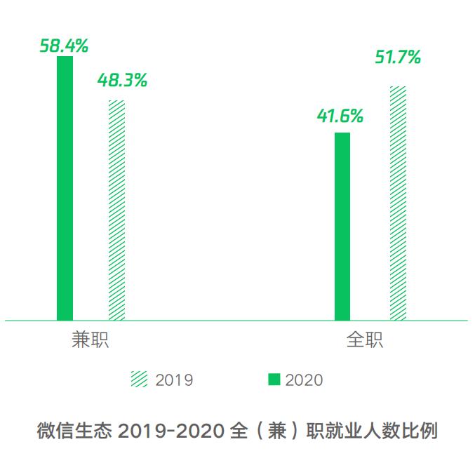王牧的工作模式,反映出的另一个特质是,新职业可能是基于平台的灵活就业。这既是年轻人的兴趣点,也是痛点。灵活就业,也许代表了自由的生活状态,也可能是没有固定工作的委婉说法。为此,一些人开始尝试在保留主业之外,兼职一份新的工作形式。根据微信平台的调研,在疫情出现后,微信生态系统中的全职从业者占比下降,兼职的从业者比例明显上升,超过半数。