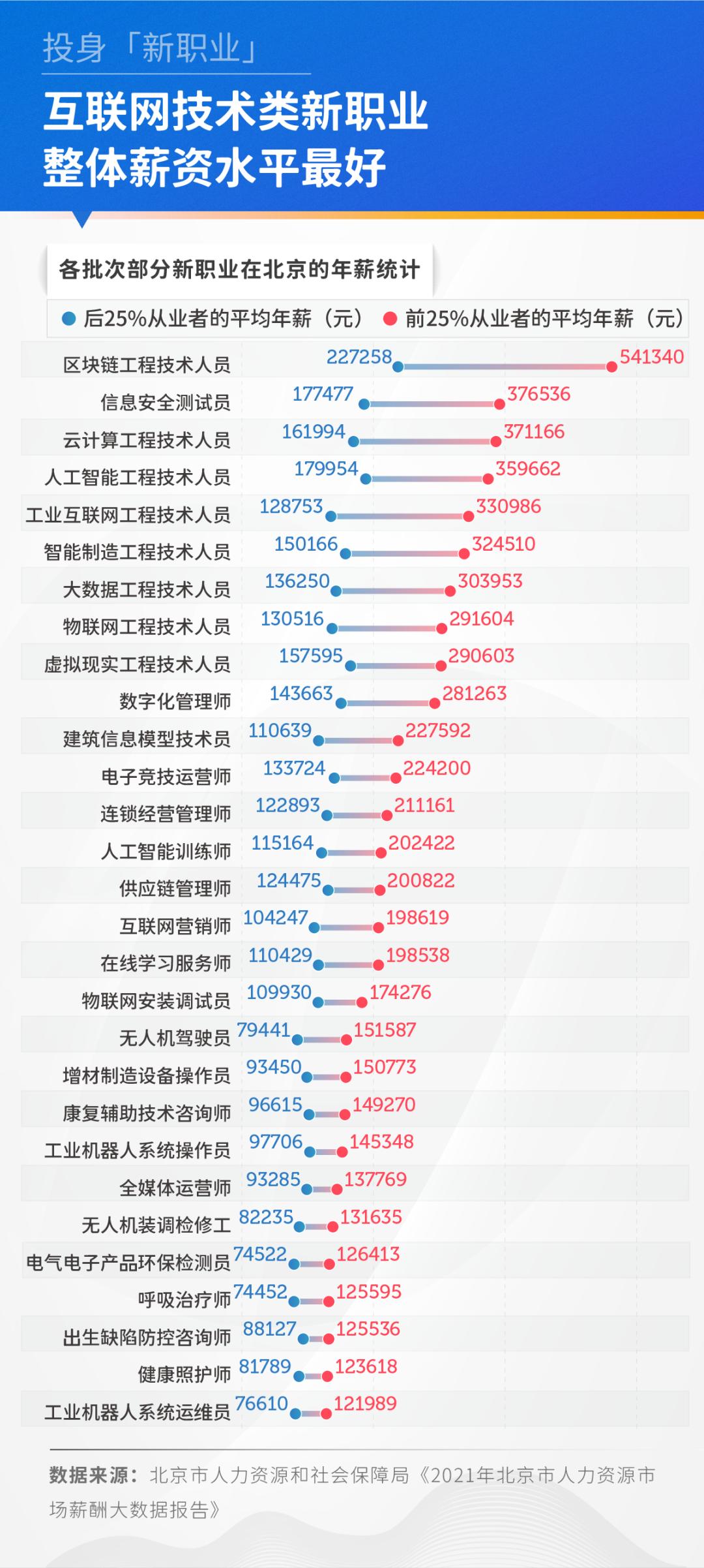 根据北京市人力资源和社会保障局发布的《2021年北京市人力资源市场薪酬大数据报告》,纳入统计的30个新职业中,薪资水平靠前的职位均隶属互联网行业。