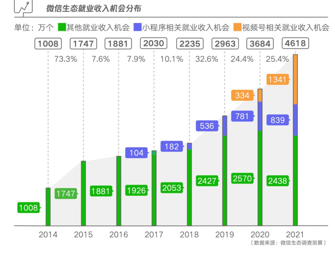 以微信生态为例。据近期中国劳动和社会保障科学研究院课题组发布的《数字生态就业创业报告》显示,随着移动互联网日益普及,人工智能、大数据、云计算等技术快速发展,加快了企业数字化转型步伐,数字生态催生了大批新职业、新岗位,数字化就业快速崛起。《报告》显示,以微信公众号、小程序、视频号、微信支付、企业微信等共同构成的微信数字生态,在2021年衍生的就业收入机会达到4618万个,同比增长25.4%。