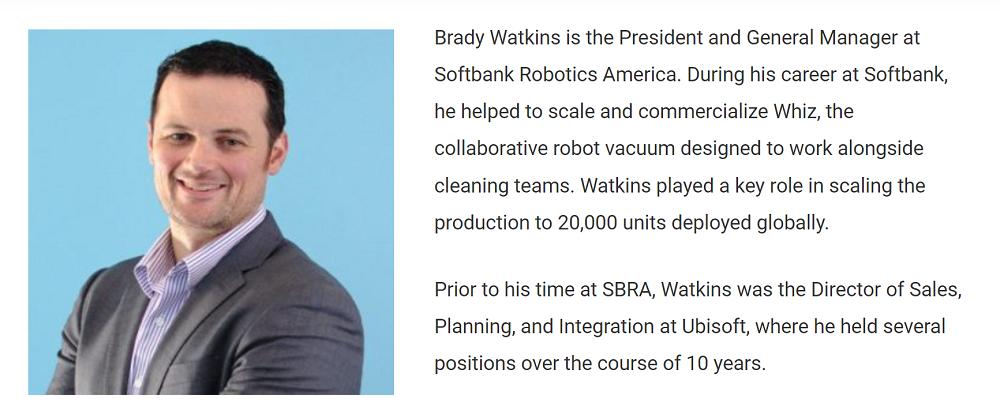 软银机器人公司(Softbank Robotics)于2012年成立,2015年它发布了人形智能机器人Pepper。至今,软银机器人公司已经在北美、东京、旧金山、波士顿、上海等地设置了办事处。SBRA是软银机器人的北美地区分公司,也是少数几家拥有SoftBank名称的分公司之一。Brady Watkins在北美地区的运营工作,让软银的智能室内机器人Whiz全球销量达到20000台,实现了Whiz的商业化。