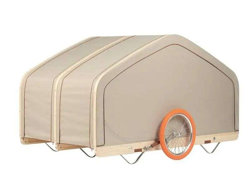 和爱马仕自行车一起发布的还有 Love Cabin 篷车,你可以把这看作两轮自行车的专属「房车」。它可以连接自行车,收起来的时候折叠起来勾在自行车后。到达目的地后,你就可以把这个篷车展开,把它变成长椅或双人床。用环保防水斜纹帆布打造的篷车也很适合露营物品收纳移动的需求。