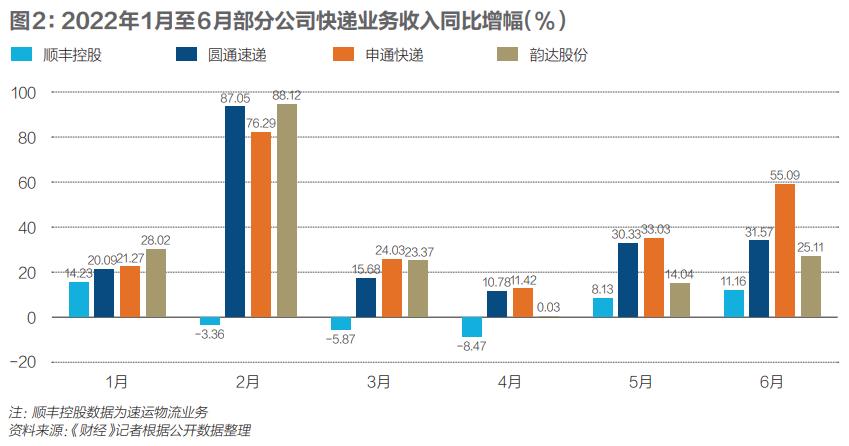 随着单价提升,快递公司业绩普遍出现好转,但也有所分化。今年1月至5月,圆通、申通、韵达收入同比都呈现增长,但顺丰除1月和5月,其余月份速运物流业务收入同比均有所下滑。6月,顺丰速运物流业务收入同比实现两位数增长,但增幅小于前几家公司。