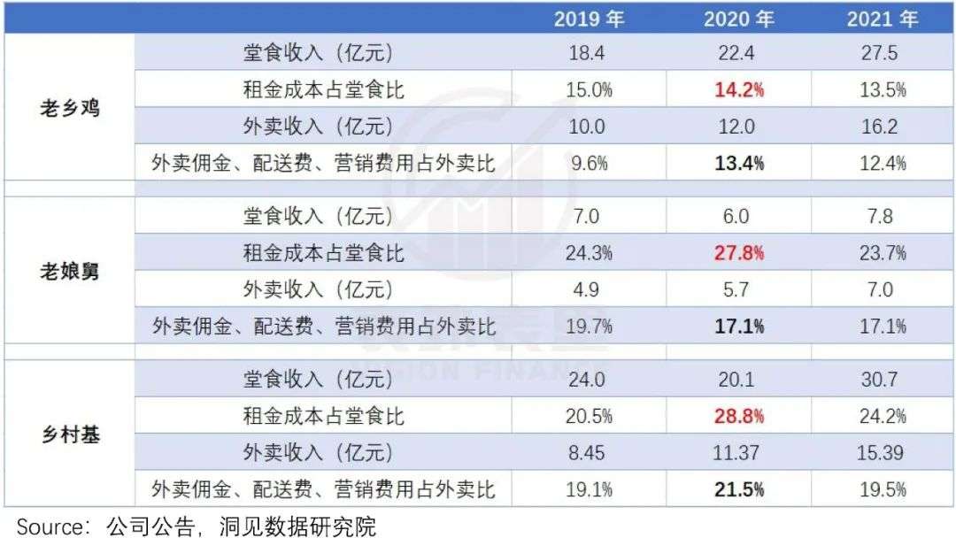 备注:老乡鸡租金成本包含在合同履约成本和费用内,参考同行的水电等支出估算。老乡鸡的外卖收入根据公开资料估算。