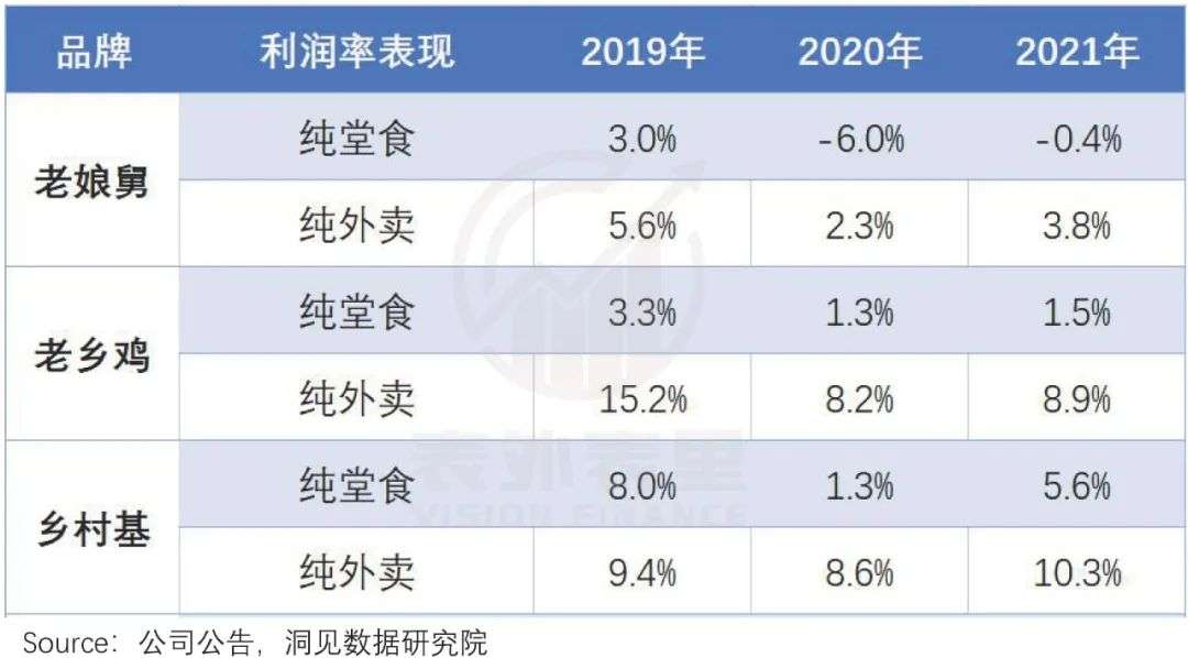 如下图,2019-2021年,老娘舅的外卖持续实现盈利,堂食在2020年和2021年是亏损的;老乡鸡和乡村基外卖堂食都盈利,且外卖利润率比堂食利润率更高。