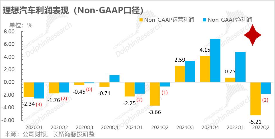 而剔除股权激励产生的费用,理想汽车二季度Non-GAAP口径的经营利润和净利润分别为-1.83亿元和-5.21亿元,连续三个季度的正盈利之后,这个季度在原材料涨价和抗疫双控压力下,还是又转为亏损了。