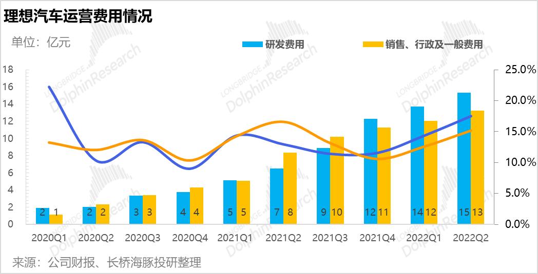 理想对2022全年的研发指引是60-70亿,二季度花掉了15.3亿,费用率在17.5%,比之前几个季度均有上升。不过现在2022全年60-70亿的研发投入指引,要控制住费用率,只有做大收入了。