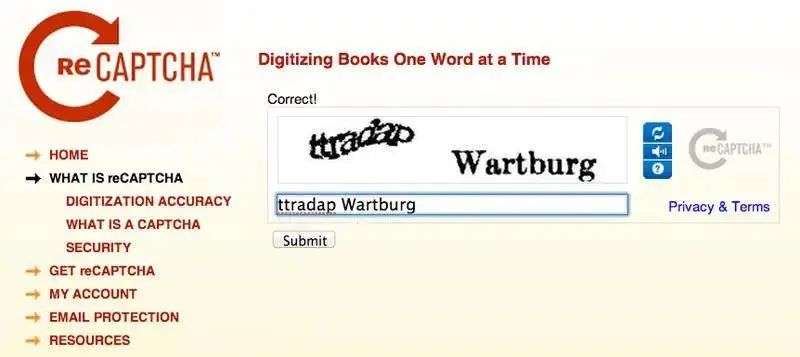 很快,研究人员意识到这项技术具有区分人类和机器人之外的潜力,他们开发了 reCAPTCHA 技术,让用户在填写验证码的过程中将纸质档案数字化,因为人类可以比计算机更好地破译老旧文献中扭曲的字母。