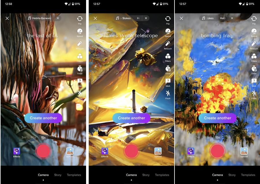 点击这个选项,然后在屏幕中间的对话框里输入一段文字描述,只用不到5秒的时间,TikTok 就可以根据文字描述生成一张竖版画作,用作短视频的背景: