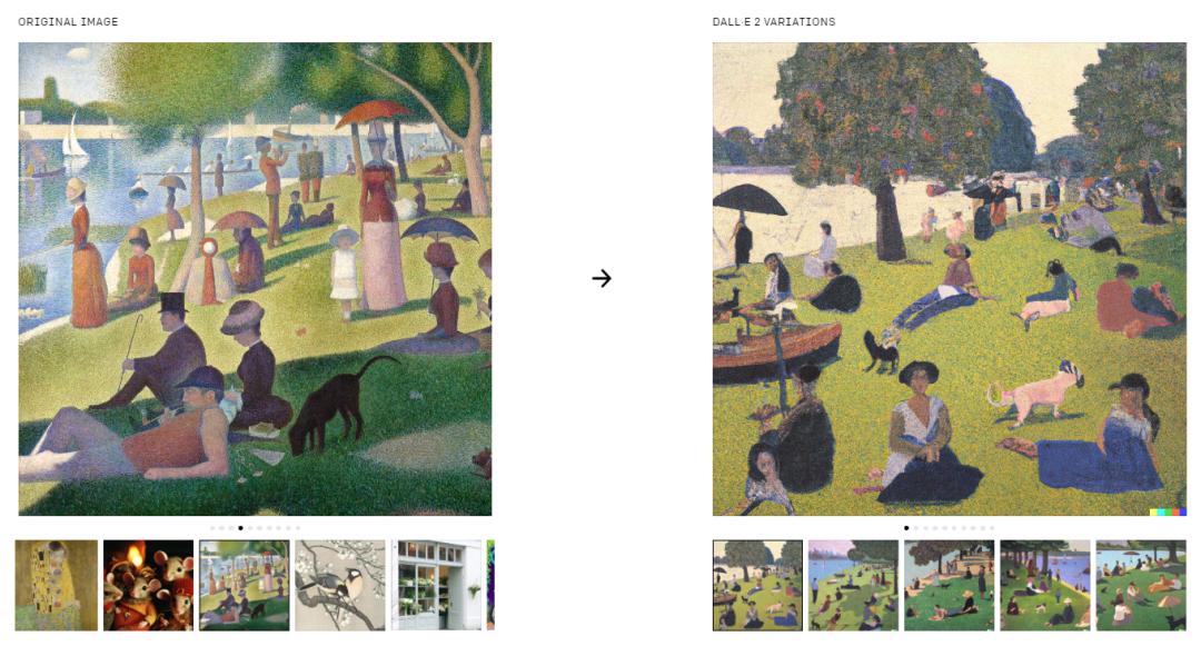 再比如 DALL·E 2 还具备“启发”的能力,能够根据一张已经给定的图片,生成风格近相同的新照片: