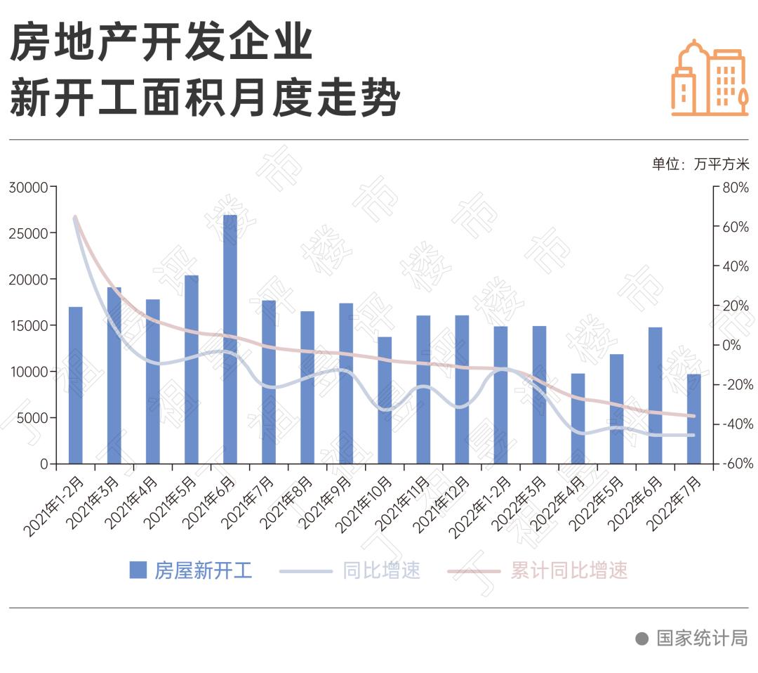 单月来看,7月房地产开发企业房屋施工、竣工和新开工分别同比下降44%、36%和45%。