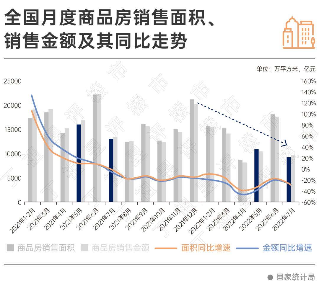 7月商品房销售面积为9255万平方米,环比降49.1%;商品房销售金额为9691亿元,环比下降45%,较5月分别下降16%和8%;同比则分别下降29%和28%,较6月降幅分别扩大了10个百分点和7个百分点。