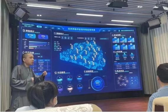 2021年5月,杭州灵隐寺成立了数字赋能研究中心,着手开展佛教寺院数字化管理探索与实践。此次发布的综合服务系统也是探索成果的公开展示,包含了“一屏、一中心、四件事、六大管理平台”,应用于对游客统计、日接待量、防疫管控、安全预警等细化场景管理。