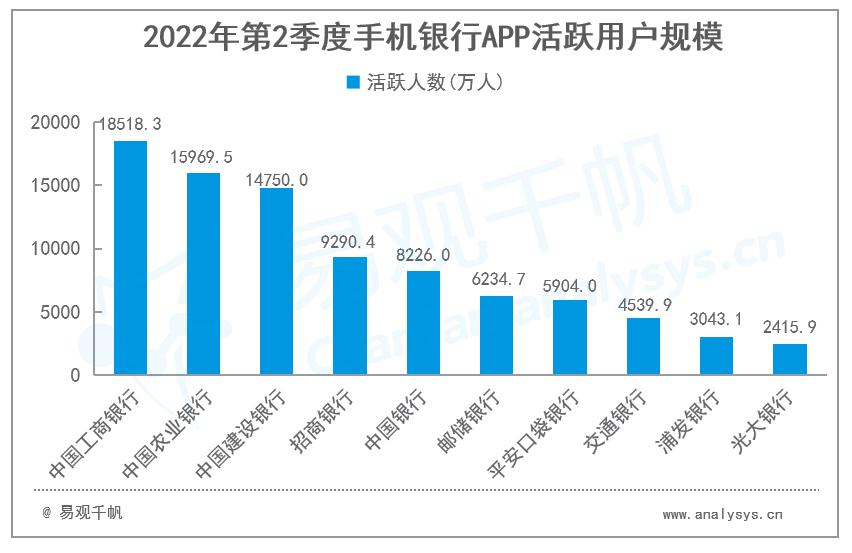 从具体APP活跃用户规模来看,2022年第2季度,中国工商银行APP、中国农业银行APP、中国建设银行APP活跃用户规模继续位列前三,分别为1.85亿人、1.60亿人、1.48亿人。
