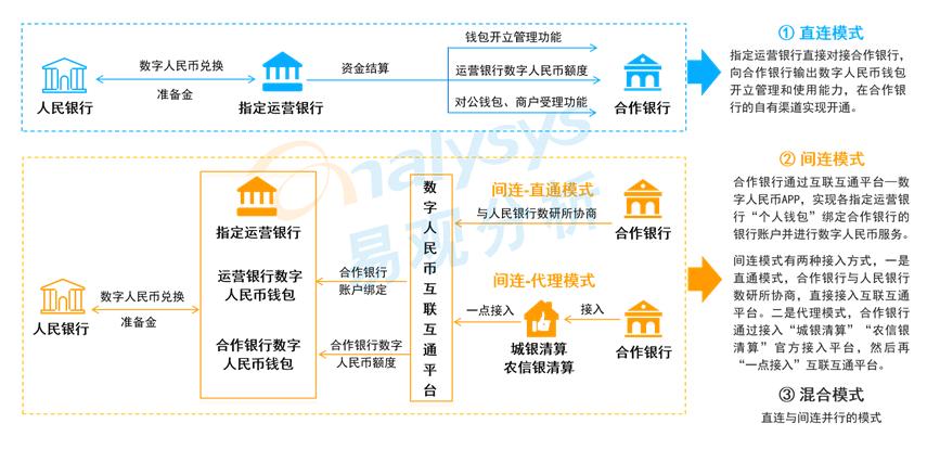 从数字人民币运营银行机构与非运营银行之间的银银合作来看,主要有直连、间连、混合三种模式。直联模式是指定运营银行直接对接合作银行,向合作银行输出数字人民币钱包开立管理和使用能力,在合作银行的自有渠道实现开通。间连模式是合作银行通过互联互通平台—数字人民币APP,实现各指定运营银行“个人钱包”绑定合作银行的银行账户并进行数字人民币服务。